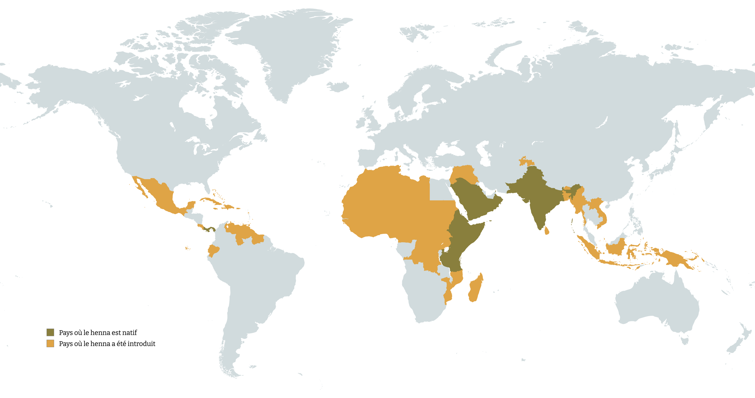 Au fil des siècles, Lawsonia inermis est passée du statut de plante sauvage à celui de plante cultivée, dans une logique à la fois utilitaire et respectueuse. Elle a été diffusée bien au delà de son aire botanique d’origine, notamment en Afrique du Nord, au Moyen-Orient et en Asie du Sud, dans des régions présentant des conditions climatiques similaires.